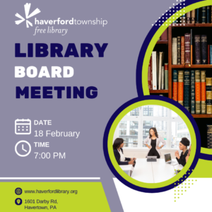 By submitting this form, you are consenting to receive marketing emails from: Haverford Township Free Library, 1601 Darby Road, Havertown, PA, 19083, http://www.haverfordlibrary.org. You can revoke your consent to receive emails at any time by using the SafeUnsubscribe® link, found at the bottom of every email. Emails are serviced by Constant Contact
